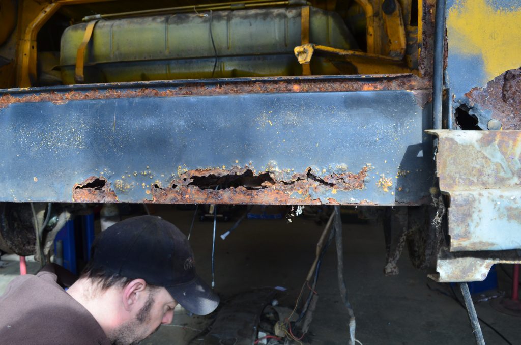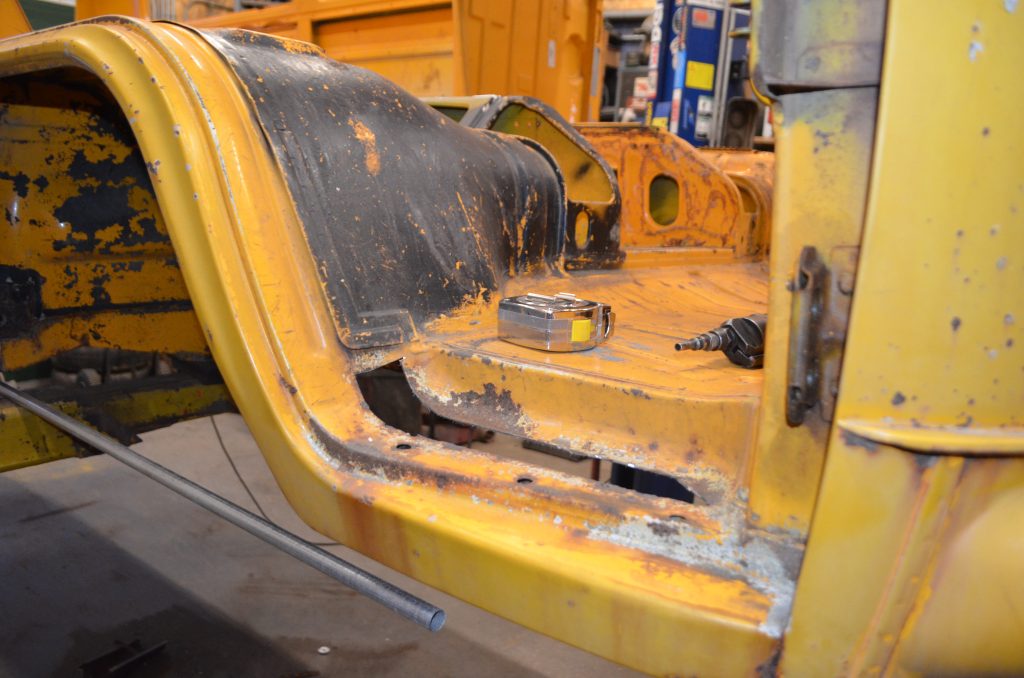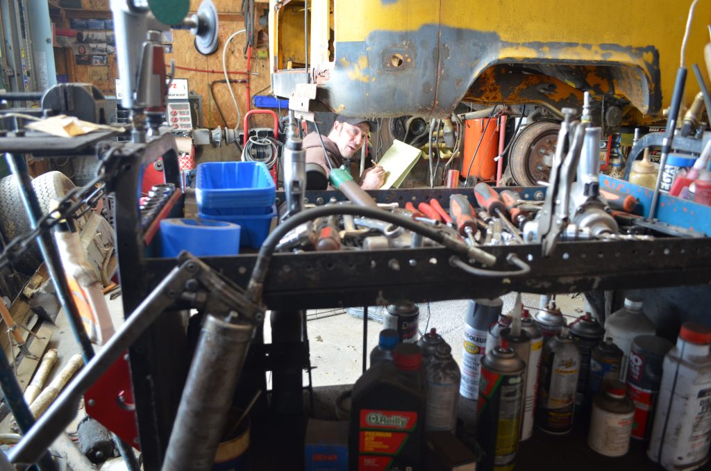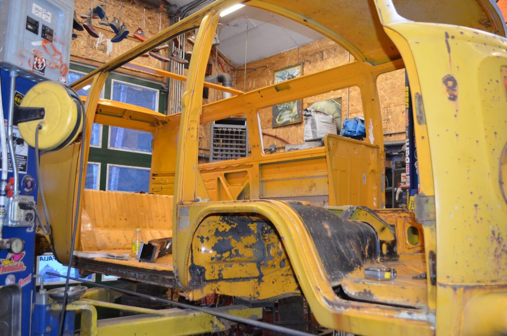 This week Evan has removed the engine and transmission. Everything is coming off and out so he can focus on the shell and body work. This is probably the most overwhelming part of the job as Evan is assessing the rust damage and making a to do list. I walked into the shop to get some photos. “Hey Evan, How’s it goin’ so far?”